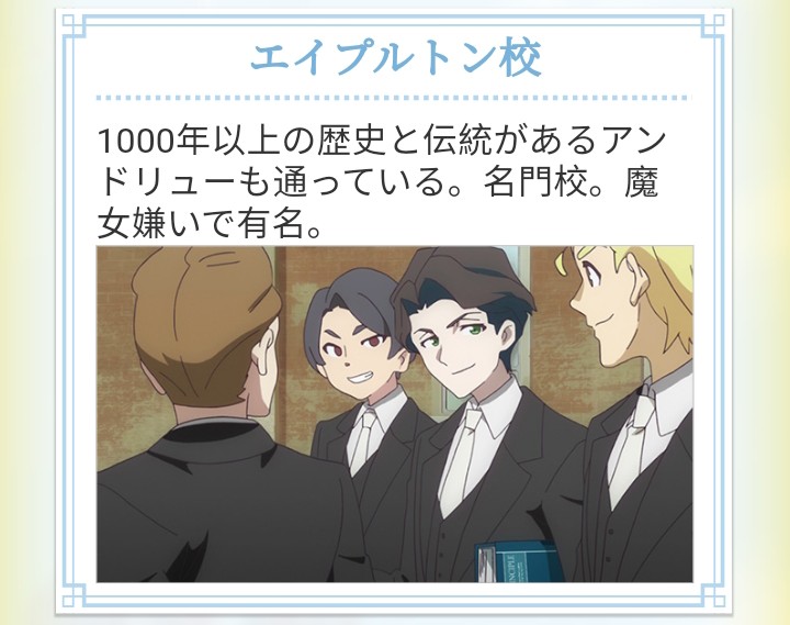 Appleton Academy (エイプルトン校,Eipuruton-kō?)[2][3] is a famous school for young men with over one thousand years of history on its name. It is known for its disdain for witches.