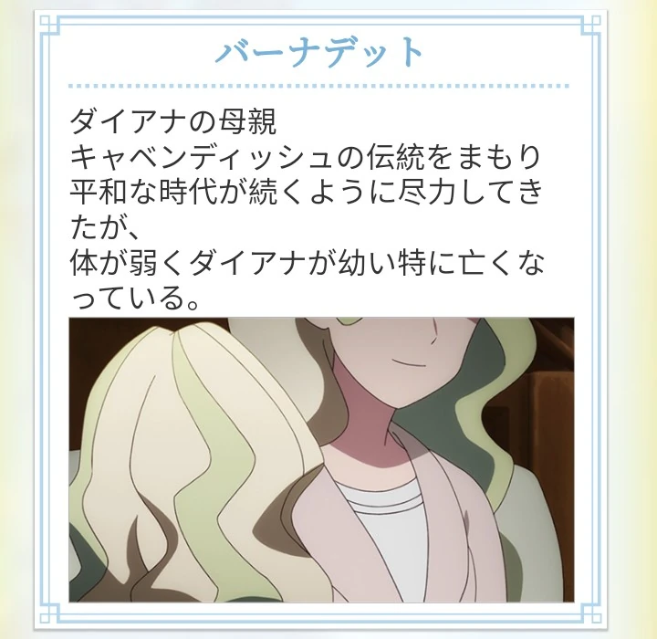 A witch born in the Cavendish House, Bernadette took over as the head of the family and always respected the traditions and honor of the family above all things. However, her weak body led her to die early. She often told her daughter, Diana Cavendish, about the first Cavendish witch, Beatrix Cavendish, as well as her hope that Diana would create a new future for magic.