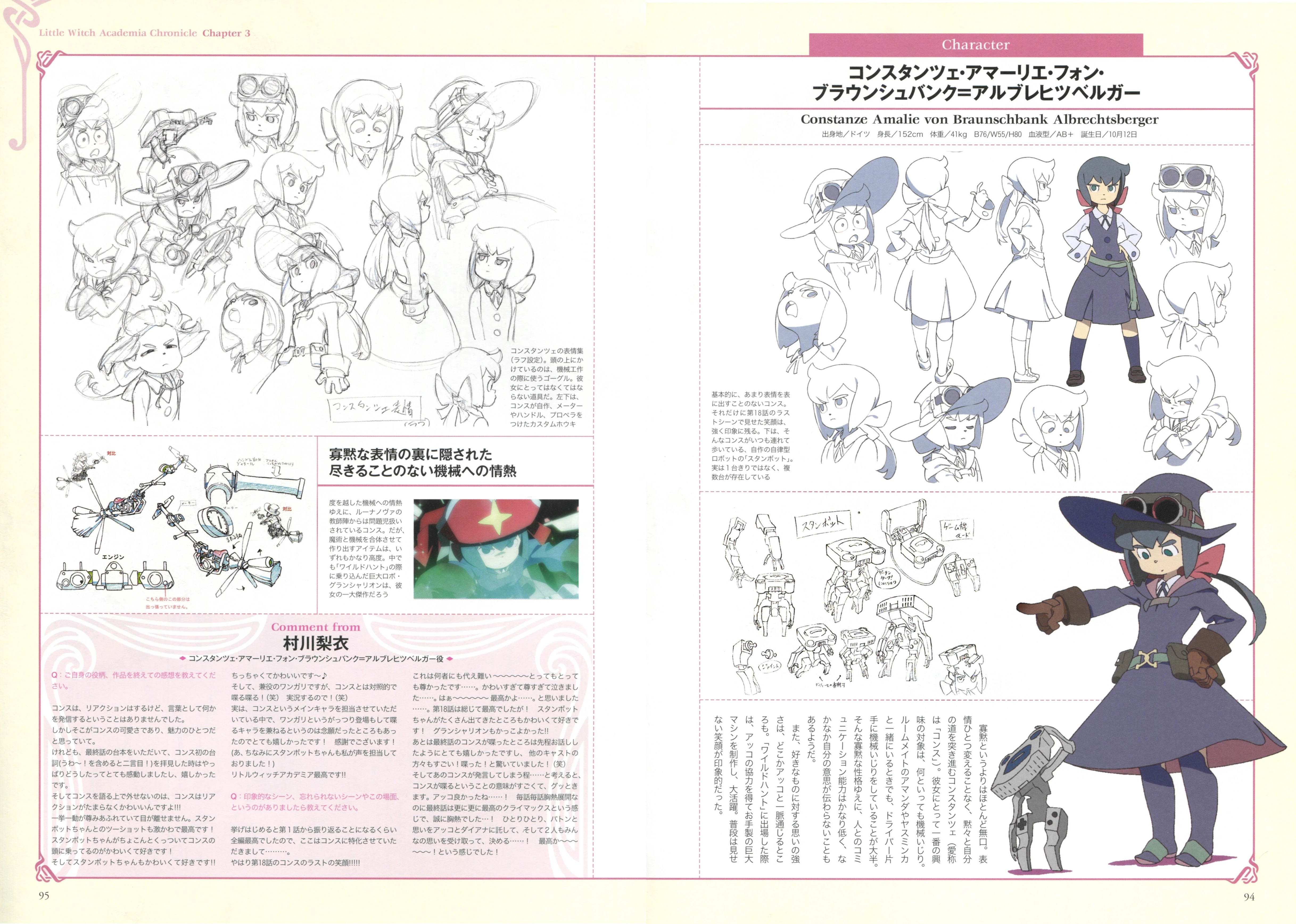 - According to the official panel of Little Witch Academia at AnimeExpo 2017, the reason why Constanze rarely speak was due to her being stuck with a terrible illness as a child; in order to heal her illness, her soul was removed from her body and placed into one of her Stanbots, which caused her to stop aging and left her in her tiny form, along with rendering her mute. The soul cannot be placed back into the body lest she gets sick again. The panel also stated that the particular Stanbot was the same one Akko unintentionally destroyed in "Sky War Stanship".[11][12][13]