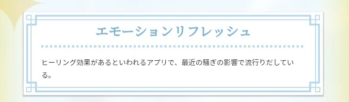Emotion Refresh (ER)[1][2] is an app developed by Croix Meridies that uses magitronic technology to absorb angry spirit energy and convert it into powerful magic. It has the same function as the Noir Fuel Spirit Devices, except it is geared towards self-administration. Users of the app employ it voluntarily in tense situations for its desirable "healing effect".