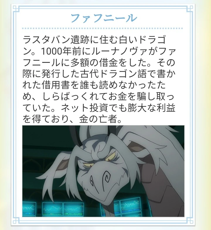 For all his valid points however, Fafnir turns out at fault in this predicament; Diana and Finnelan, who have properly deciphered Dragonese used in the contract, confirmed that paying the interest was never part of it in the first place. He had lied to them about it through taking advantage of their inability to understand the language as well as underestimating its importance. With his treachery exposed, Fafnir has no choice but to relinquish Luna Nova's Sorcerer's Stone he confiscated earlier.