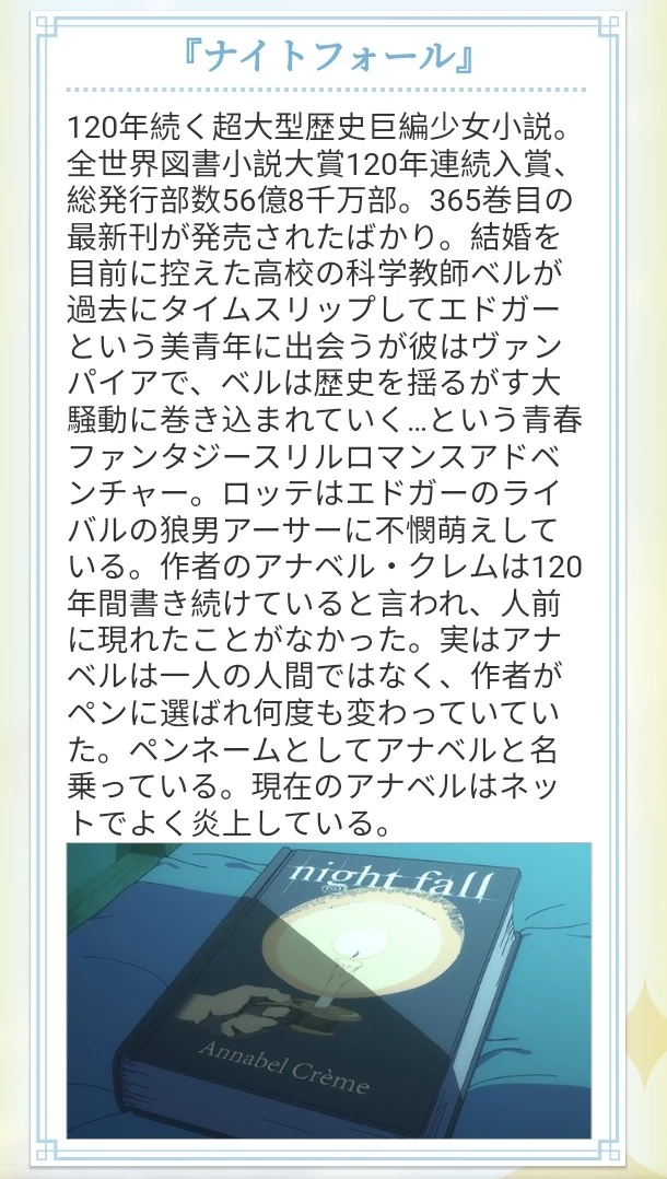 Night Fall (ナイトフォール Naito Fōru) is a series of popular historic fiction novels for girls written by several writers over the years, under the name of Annabel Crème. The plot revolves around a couple of lovers, Belle and Edgar, a science teacher and a vampire of the Middle Ages who are known due to a mysterious time portal. The series is currently composed of 365 volumes, having been written for 120 years. While the official story to the public is that the books were written by a single witch, the truth is that the authors have been renewed over the years, being chosen by a magic pen created by the first author. The current author is the twelfth person chosen to be Annabel.
