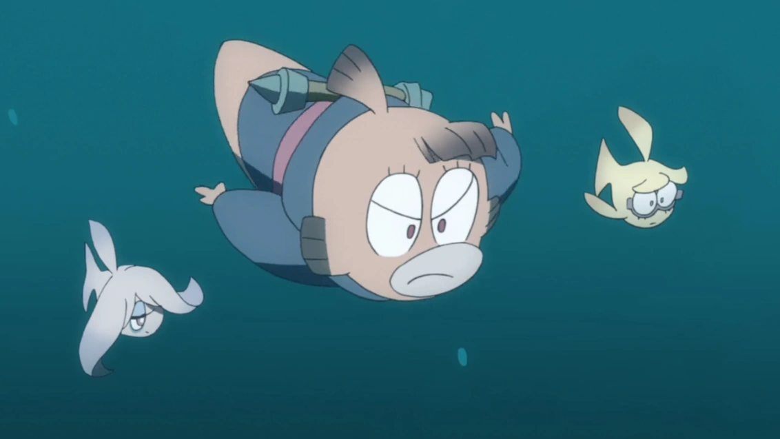 Whereas Ursula posed as Pisces with the aid of an eraser bewitched into a not-so-convincing-looking fish lure placed into Pisces' bowl and fooled Nelson in the process, Akko, Lotte, and Sucy turned into a fish to find the real Pisces, though Akko was only able to transform halfway, so that she looked more like a large, cartoonish-looking anthropomorphic fish that retained her hairstyle and outfit. The three friends' search went to a dead end when Akko met a lonely fish whose family was trapped in a poacher's fish cage. Lotte tried to tell Akko that they had no time to help the lonely fish's family. However, Akko, unable to leave them to their fate, sacrificed her remaining magic energy reserve to free them all before berating the fish cage's owner and returning his cage. Though they managed to find Pisces along the way, they ended up caught by Finnelan and other professors just as they returned to the school before being brought to the Headmistress's office.