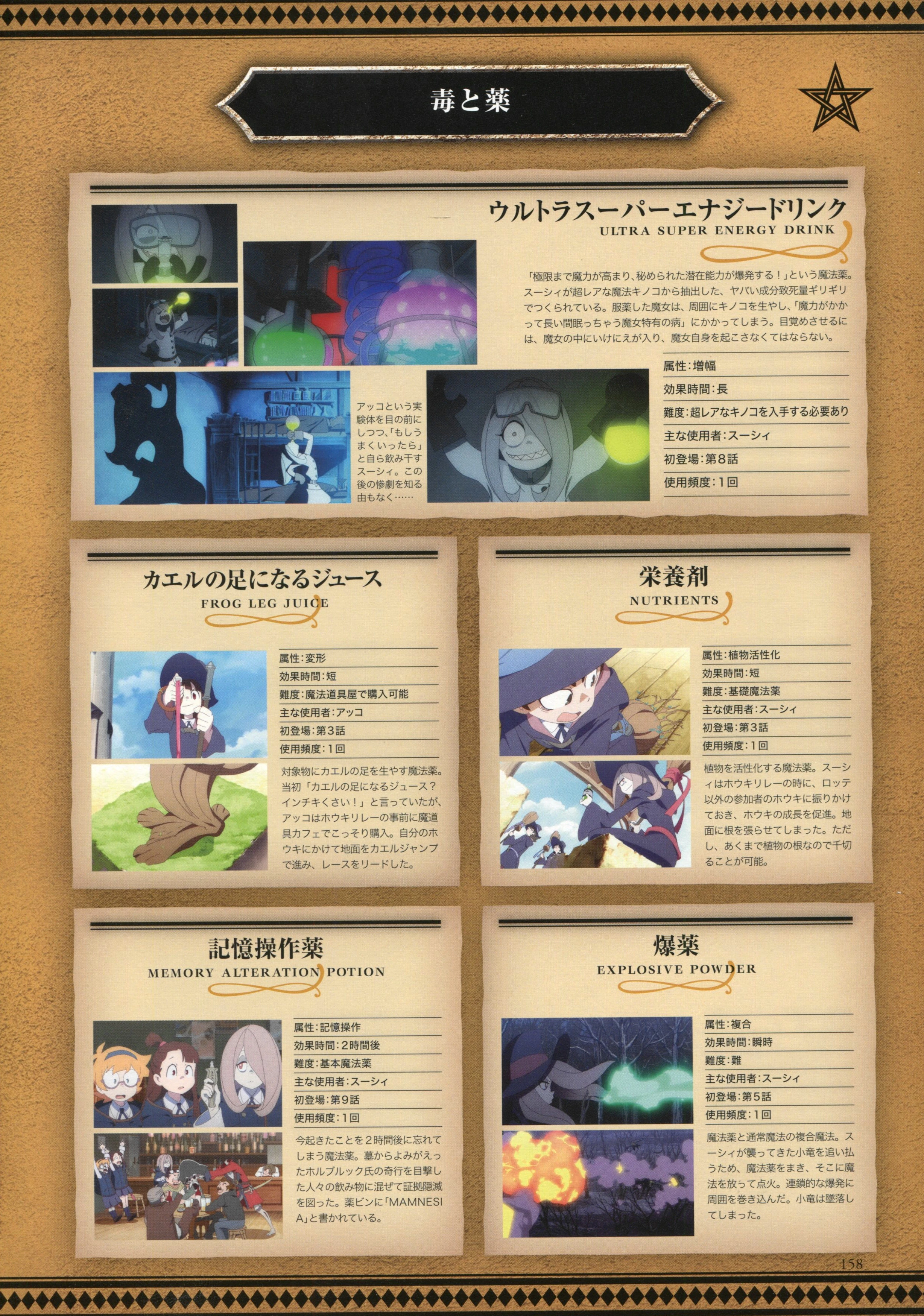 - It's interesting to note that potions in Little Witch Academia series can be utilized in more versatile manner in addition of being consumed, be it as a weapon (ex. Poison Gas Potion), spilled/applied onto objects to bewitch them (ex. unconsumable variant of Puppet Magic Potion), or processed into gel or powder state (ex. Mending Magic powder, Sealing Glue) all relative to their intended purpose. Potions in other fantasy works such as Harry Potter by contrast are strictly limited to provide buffs and other beneficial effects to the drinker with a handful of exceptions.