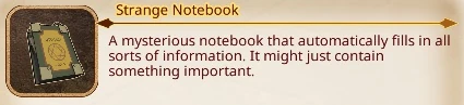A Strange Notebook is a notebook enchanted with a spell so it can automatically document magic, creatures, and items the user encountered. This book is primarily featured in Chamber of Time.